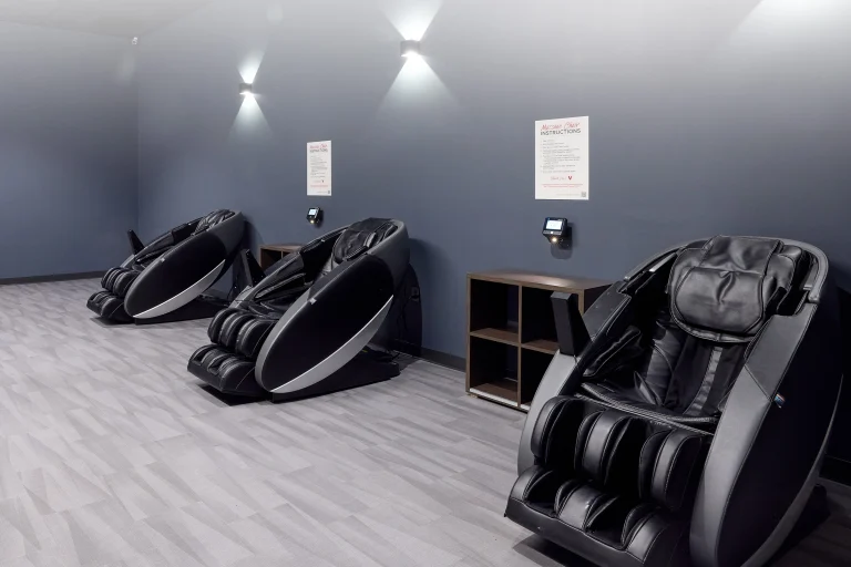 When you’re ready to enjoy a massage, head to the check-in desk at the front of the club and tell a VASA team member how long you’d like to sit in the lounger—up to 10 minutes. You’ll be assigned a lounger number. Once you’re settled in, use the touchscreen to start your massage and adjust the pressure. Sit back, relax, and enjoy!
