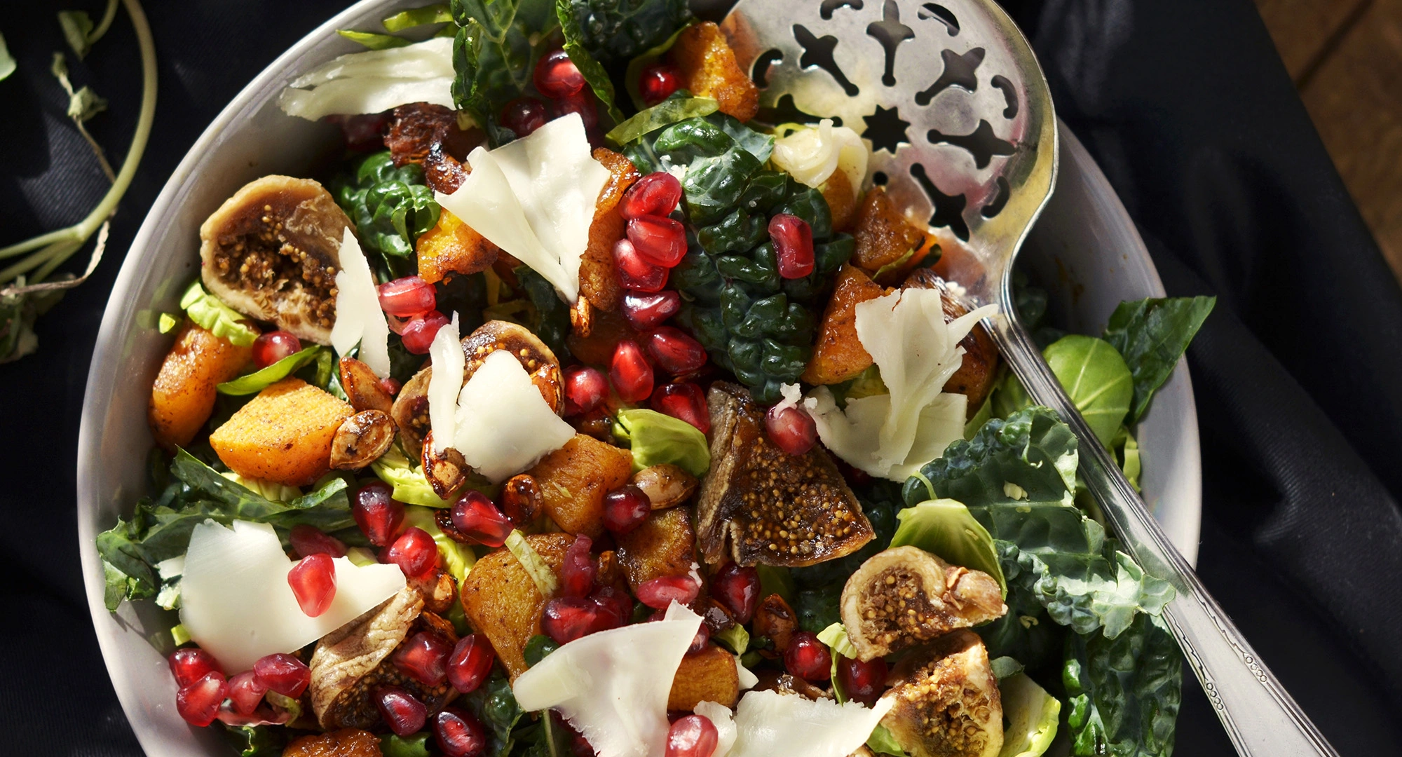 Packed with fiber, color, and flavor, this vibrant salad balances out heavier holiday dishes. Roasted butternut squash adds natural sweetness and a boost of vitamin A and potassium, while kale brings crunch, fiber, and vitamin C to help support digestion and immunity. Dried cranberries, nuts, and a tangy maple vinaigrette round it all out.