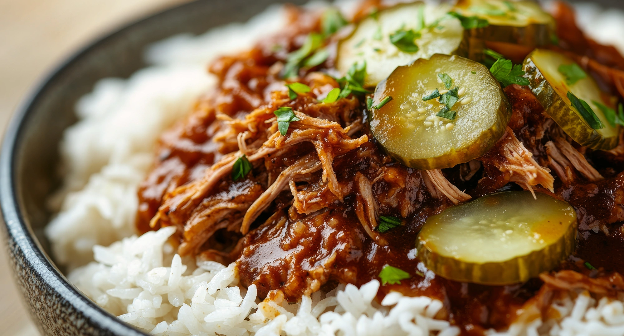 - To assemble: to each serving bowl, add ½ to ¾ cup rice, ⅓ to ½ cup slaw, and ½ to ¾ cup of the shredded pork. Drizzle with additional BBQ sauce. Garnish with pickles and sliced green onions.