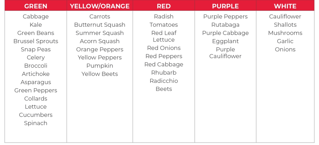 Picture your plate as a blank canvas: the more color you add, the better your energy and nutrition will be.