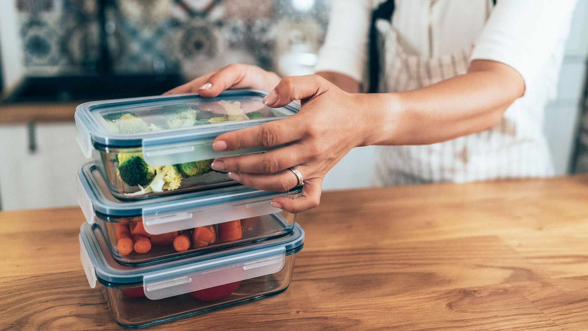 Muchos de los que actualmente preparan comidas pasarán dos o tres horas cada fin de semana comprando, cocinando y repartiendo todos o algunos de sus almuerzos, refrigerios y cenas de la semana. Alternativamente, puede preparar la comida en porciones más pequeñas, atendiendo a dos o tres días de comida a la vez en lugar de toda la semana. Dependerá de usted y de su horario qué enfoque funciona mejor, pero elija la opción en la que podrá realizar 80% la mayor parte del tiempo.